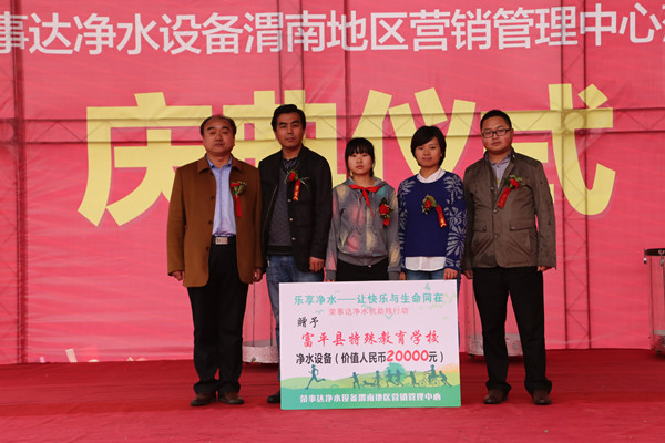 •     榮事達(dá)水工業(yè)公司發(fā)起的“樂(lè)享凈水——讓快樂(lè)與生命同在”助殘公益項(xiàng)目自正式啟動(dòng)以來(lái),受到全國(guó)各地代理商的鼎力支持。日前,榮事達(dá)凈水機(jī)陜西渭南營(yíng)銷(xiāo)管理中心正式落成,當(dāng)?shù)卮砩谭e極參與助殘行動(dòng),于開(kāi)業(yè)之際向富平縣特殊教育學(xué)校捐贈(zèng)了多臺(tái)凈水設(shè)備。