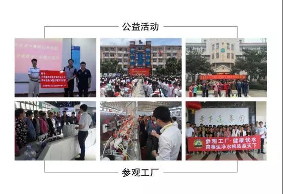 榮事達針對消費者對凈水機了解不足的問題,長期推出“參觀工廠”活動,讓消費者全面見證產品生產和質檢的流程,加強消費者對凈水機的種類、功能、技術的認知,引導消費者正確認識和選購凈水機。同時,關注弱勢群體,積極踐行公益,發起過“愛心傳遞 健康助學”等多項活動,在2015年攜手安徽省青年志愿者協會啟動“樂享凈水”大型助殘公益項目,榮獲安徽省志愿者服務項目大賽二等獎,號召并帶動更多愛心人士投入其中,樹立起公益典型,該活動已在安徽、湖北、湖南、江蘇、江西、河南、山東、陜西、廣西等多個省份,為400多個助殘機構及殘疾人士家庭提供公益服務,捐贈、安裝凈水設備1500多套,開展各項幫扶活動、健康飲水知識講座500余次,受惠殘疾人口超過30000人;日前,為全國首個希望小學——金寨縣希望小學免費提供了直飲水設備,發起“給山區孩子一杯水”援建金寨中小學生凈水設備公益活動,解決山區孩子飲水難題。